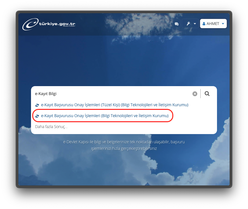 Giriş yaptıktan sonra, arama kısmına "E-Kayıt Bilgi" yazarak veya buraya tıklayarak Bilgi Teknolojileri ve İletişim Kurumu'na ait e-Kayıt Başvurusu Onay İşlemleri sayfasına giriş yapın.